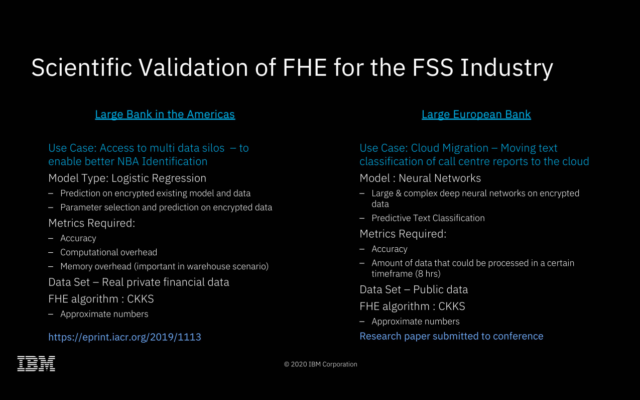 The American trial involved was based upon using machine-learning models to predict the likelihood of a loan being issued and given access to retail banking, loan, and investment information for a large group of customers. The dataset consisted of 364,000 entries, with several hundred features—and the model needed to identify relatively rare events (about 1 percent) in the dataset. Success for the trial was based on the encrypted predictions having similar accuracy to baseline, variable selection with similar accuracy, and acceptable compute overhead.