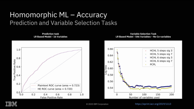 In the next image, we can see that the result curves of a machine-learning prediction task are very nearly identical whether the operations were done on data in the clear or on FHE-encrypted data. We wondered about the remaining difference—was FHE a little bit lossy? Not exactly, Bergamaschi explained. The model in use is based on floating-point data, not integer—and it's the floats themselves that are a little lossy, not the encryption.